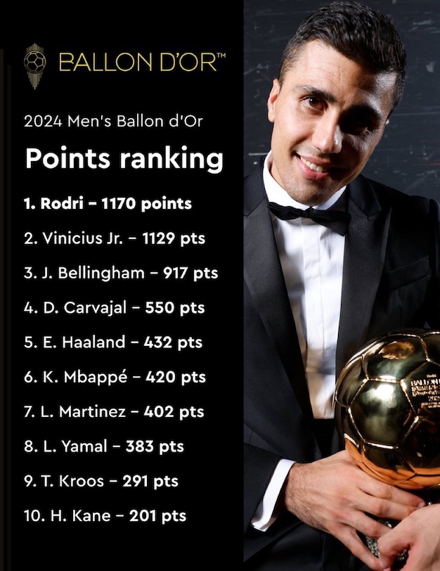 Le milieu de terrain de Manchester City a reçu un total de 1170 points, tandis que le joueur du Real Madrid a reçu 1129 points. Dans le classement final, Bellingham a terminé 3ème, Carvajal 4ème et Haaland 5ème. Kylian Mbappé s'est emparé de la sixième place. Lautaro (7e), Lamine Yamal (8e), Kroos (9e) et Harry Kane (10e) complètent le top 10.